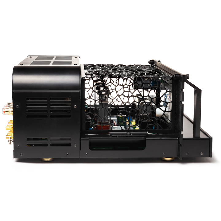 Ультралинейная схема, где потенциал экранирующей сетки формируется не резисторами, а специальными отводами с первичной обмотки выходного трансформатора, позволяет получить максимально широкую АЧХ без применения ООС, что в свою очередь, весьма благотворно сказывается на динамике и глубине сцены. Максимально короткий тракт - входной буфер-фазоинвертор-оконечный каскад, и применение специализированных межкаскадных металлобумажных конденсаторов, сводят к минимуму собственное влияние усилителя на сигнал и позволяют слушателю наслаждаться музыкой, не отвлекаясь на технические подробности.